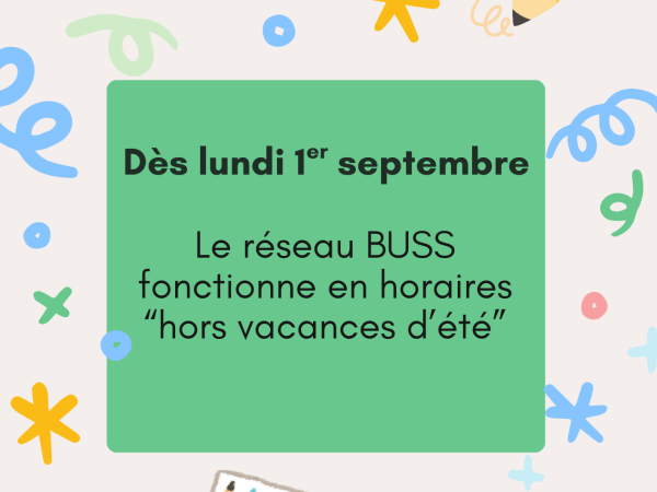 Dès lundi 1er septembre, le réseau BUSS fonctionne aux horaires "hors vacances été". Publié le 29/08/2025 Le réseau