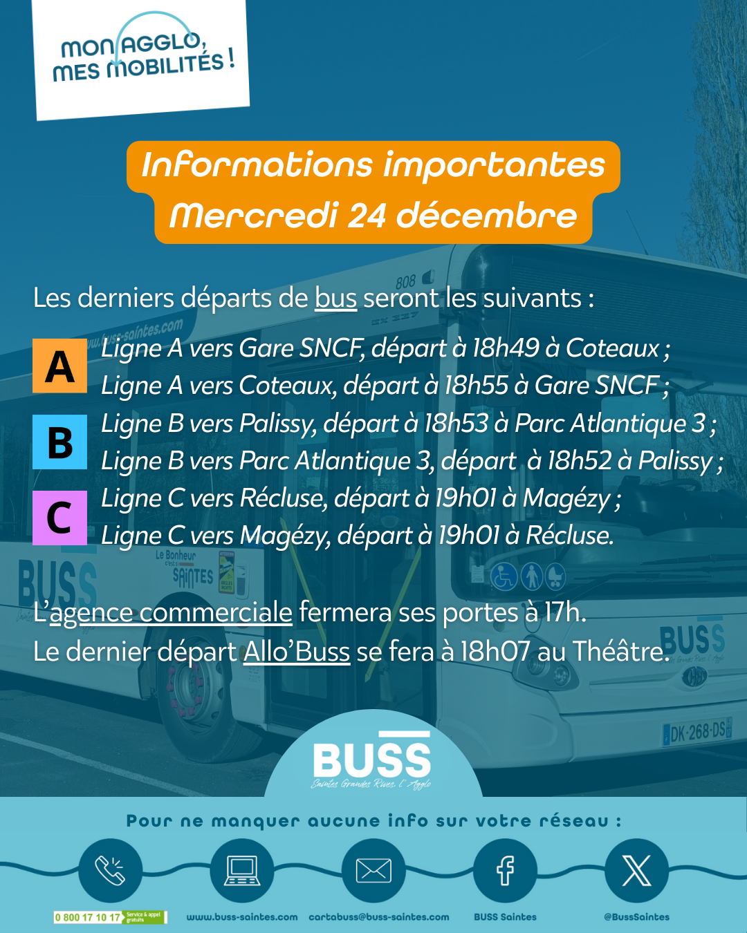 À l’occasion du 24 décembre, les horaires de circulation de votre réseau BUSS sont adaptés.